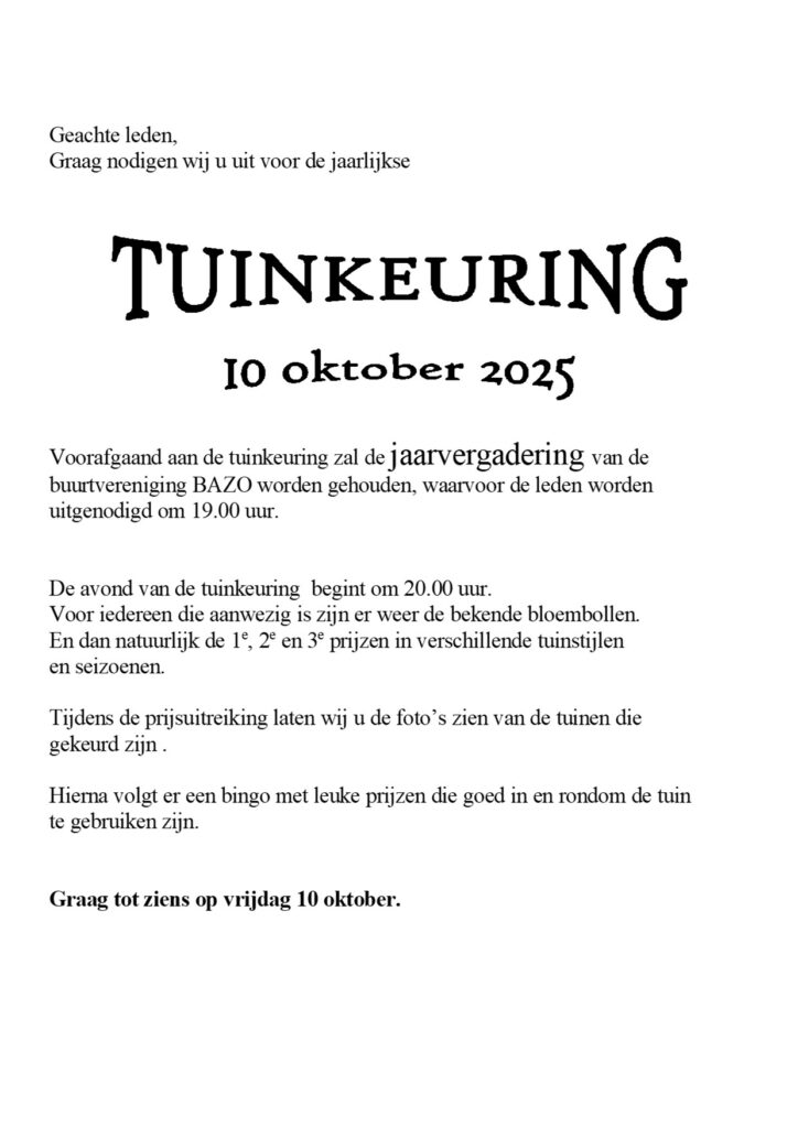 • Jaarvergadering en tuinkeuring 10 oktober 2025